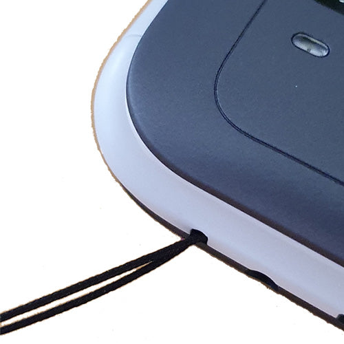 3. Take the top end (grey part) of the lanyard and thread it through the eye of the black string and pull the grey lanyard all the way through to secure the lanyard to the phone.